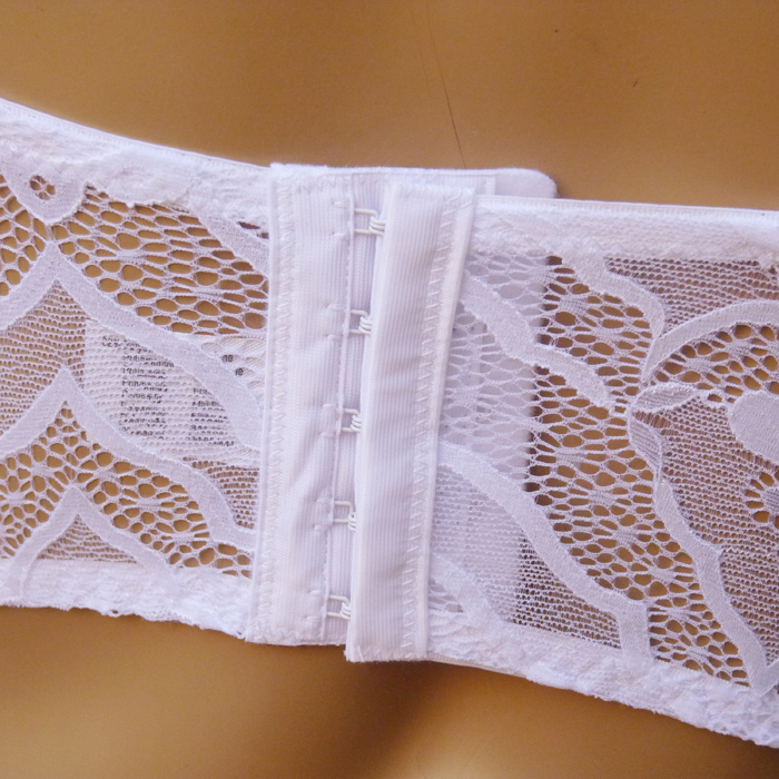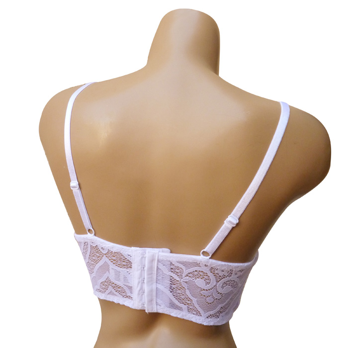 Soutien gorge bustier. Fleurs brodées sur maille filet stretch. Soutien-gorge rembourré avec baleines. Bande de dentelle ajourée sur la partie basse et le tour du dos. Bijoux placé au creux du décolleté. Fines bretelles réglables. fermeture dos par 5 agrafes 3 positions. 3 tailles dans le paquet: S/M (3B), L(4B), XL(5B).