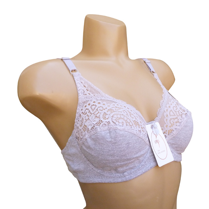 Soutien gorge grande taille, Bonnet D, coton majoritaire. Soutien gorge avec armatures et non rembourré. Soutien gorge uni avec motif "pois" sur la partie inférieure et fleurs brodées sur la partie supérieure. Brides réglables. Ouverture dos, 2 agrafes triple positions d'accroches. 6 Tailles : 95D à 120D.