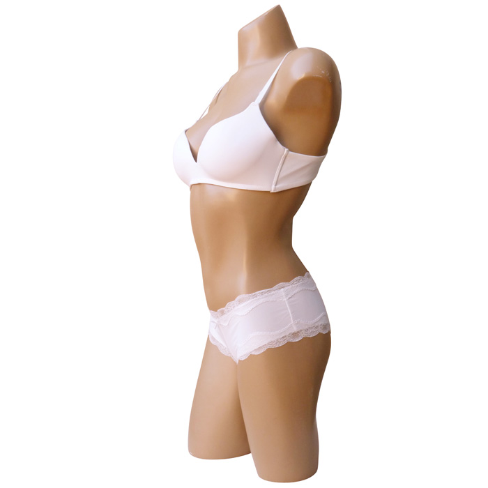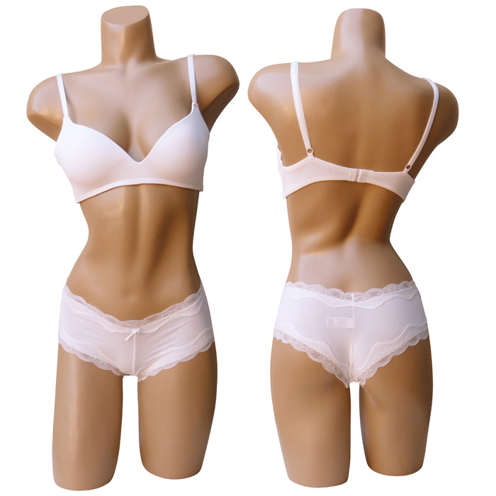 Ensemble soutien gorge avec boxer. Soutien gorge bonnet B sans armatures. Soutien gorge coques souples, bonnets lisses préformés. Soutien-gorge en microfibre. Brides réglables et non amovibles. Fermeture dos par 2 agrafes et 3 positions d'accroches. Boxer en microfibre lycra et dentelle sur le pourtour des cuisses et de la taille. 6 tailles de soutien-gorge et 3 tailles de boxer (2x M- 2x L -2x XL).