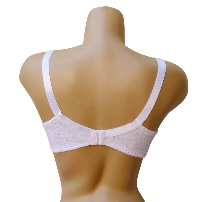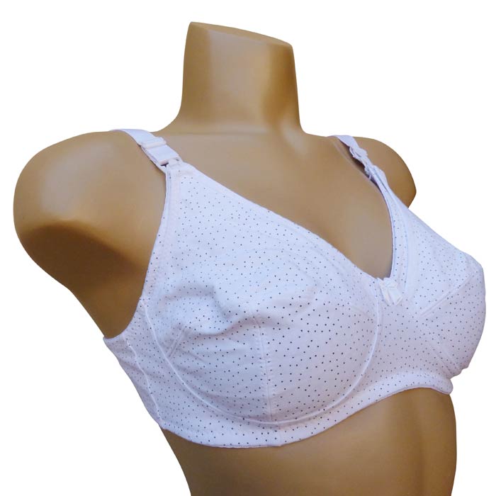Soutien gorge d'allaitement non rembourré et sans armatures, bonnet C. Ouverture des bonnets par un simple clic au niveau des bretelles. Motif " petit pois noir" sur l'ensemble du bonnet. 6 tailles.