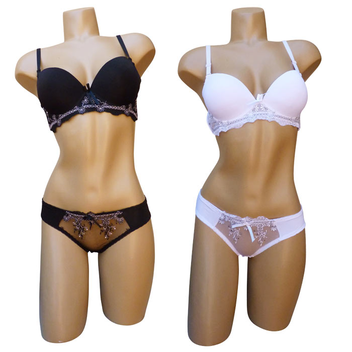 Ensemble soutien gorge avec slip. Soutien gorge bonnet C, coques lisses et souples avec baleines. Fleurs brodées sur maille filet stretch sur le bas du bonnet. Nœud satiné entre bonnet. Bretelle réglables et amovibles. Slip, triangle de fleurs brodées sur filet transparent. Livré sur cintre. 6 tailles : 85C au 110C. taille européenne indiquée sur étiquette