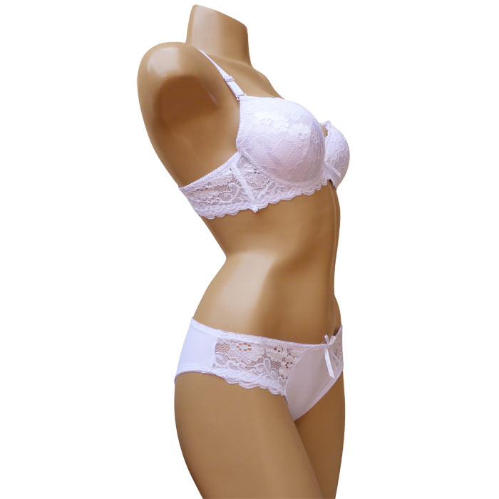 Ensemble soutien gorge, Bonnet C, bonnets coqués rembourrés avec armatures. Broderies motif "fleurs" sur maille filet stretch sur l'ensemble du bonnet. Soutien gorge dentelé sur le haut et le bas du bonnet. Nœud satin ton sur ton entre-bonnet. Brides réglables et amovibles. Slip, Rappel dentelle sur les côtés, uni à l'arrière. 6 tailles.