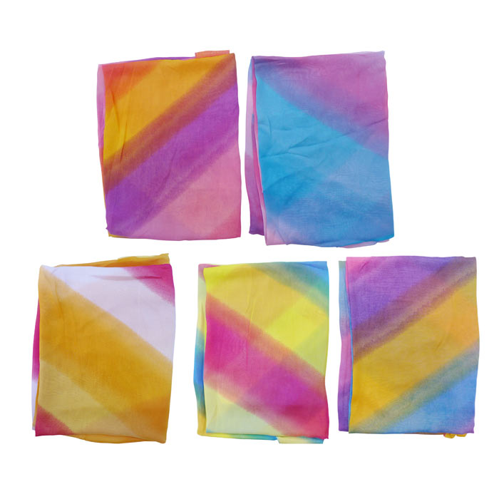 Paréo voile --> Paréo voile stretch, dégradés de couleurs, type arc-en-ciel. Se noue autour du cou ou sur le côté. Largeur = 96cm, Longueur = 188cm. Vendu par lot de 6 pièces.